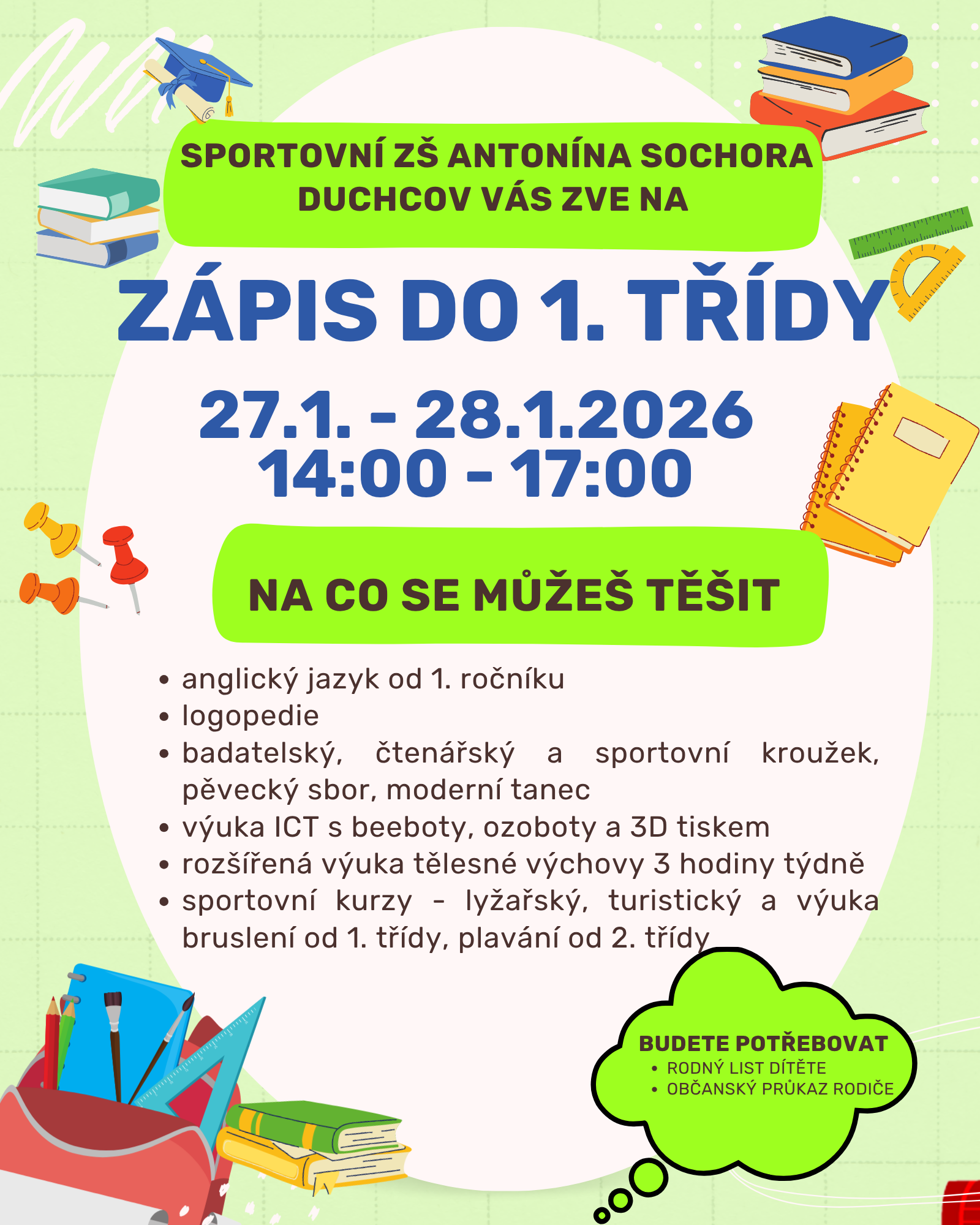 Rodiče, kteří mají zájem o umístění svého dítěte do první třídy na naší škole, si mohou stáhnout potřebné doklady na těchto stránkách a již nyní se předběžně přihlásit na naší škole.