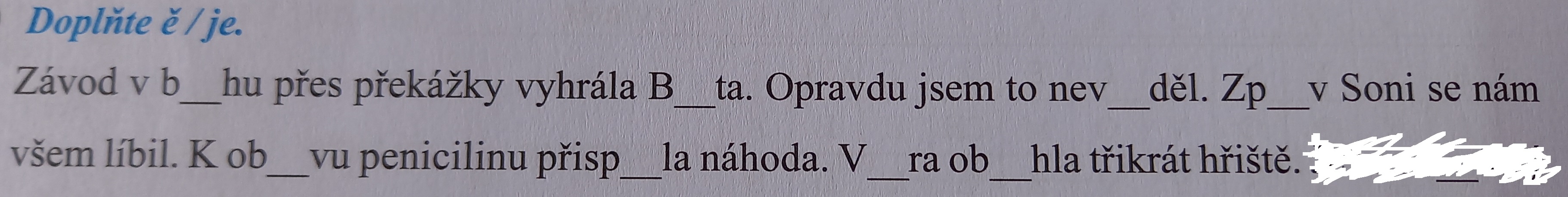 PRO VŠECHNY ŽÁKY!!!!!!!!! Toto cvičení Doplň ě/je (Velikost: 431.2 kB) doplň a přepiš do žlutého sešitu. Dej si záležet, je to na známky. Vypracovaný úkol mi pošli na e-mail: znojemska.eliska@zssochora.cz