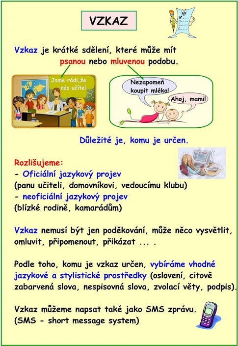 Co je to vzkaz? Podívej se do přílohy Vzkaz (Velikost: 136.58 kB), pak vypracuj pracovní list Vzkaz (Velikost: 39 kB).