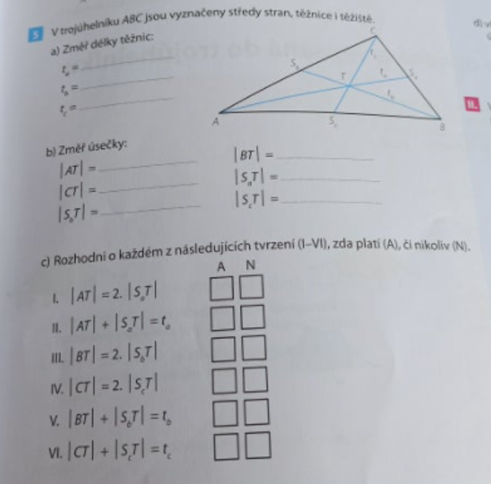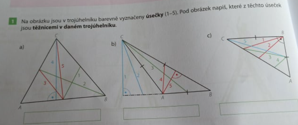4) Nakonec trojúhelníkům níže narýsuj těžnice (modře)