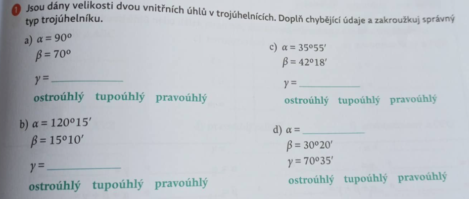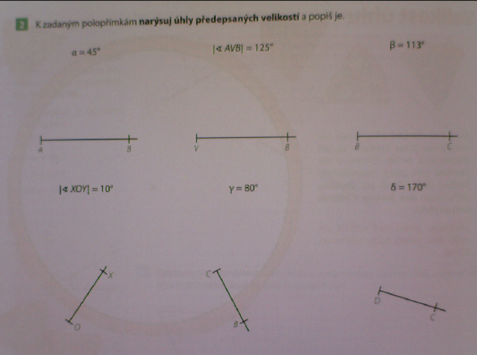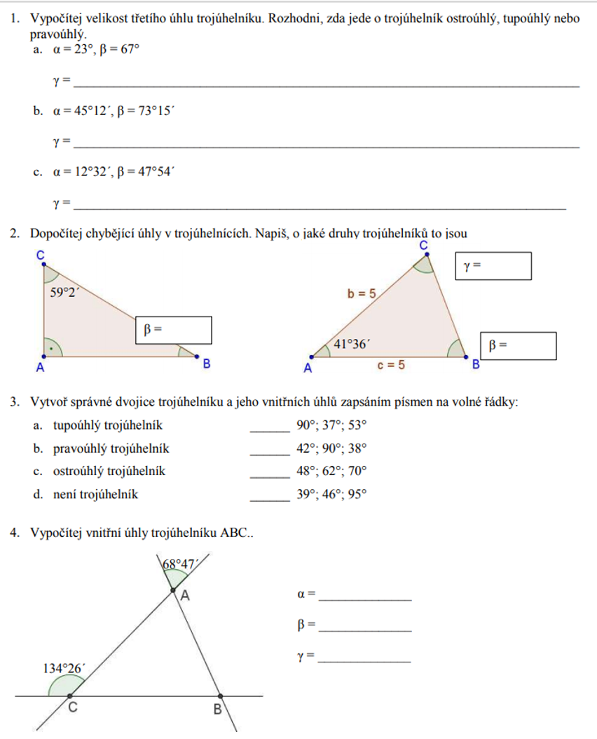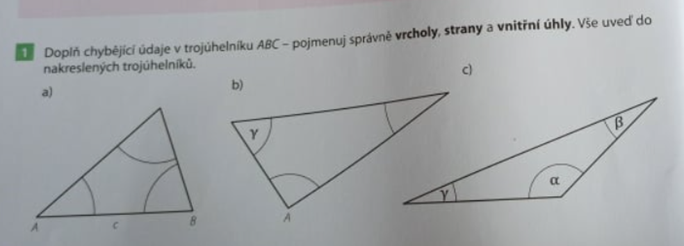 - Na obrázku je náčrt trojúhelníku. Trojúhelník narýsuj. (nejdříve stranu AB, poté úhloměrem úhel u vrcholu B, poté úhel u vrcholu A, kde se mi úhly spojí je bod C a nakonec vše spojíme. )