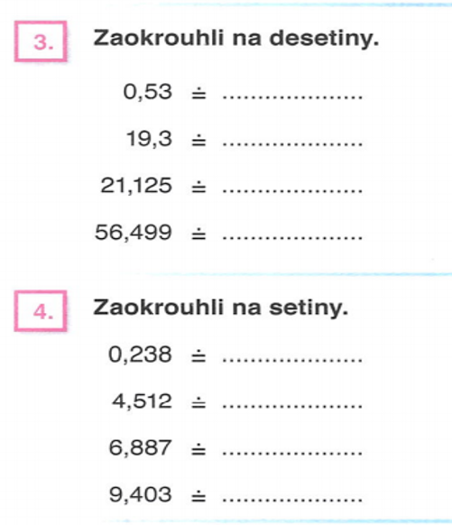 3) nyní budeme zaokrouhlovat desetinná čísla. Nejdříve se podívej na video zde. Komu nejde spustit video vše je popsané v učebnici na str. 82.
