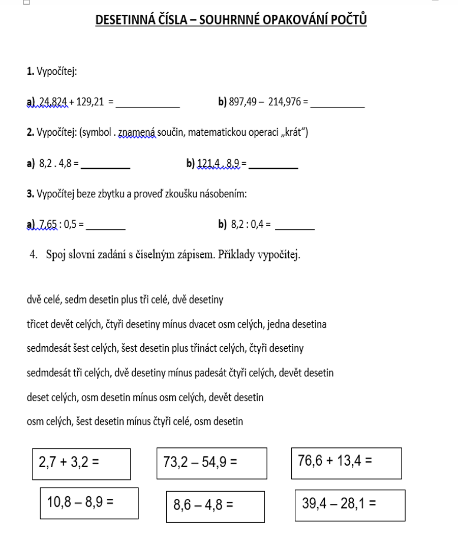 1) napiš do sešitu datum 21.10 a téma: Sčítání a odčítání desetinných čísel