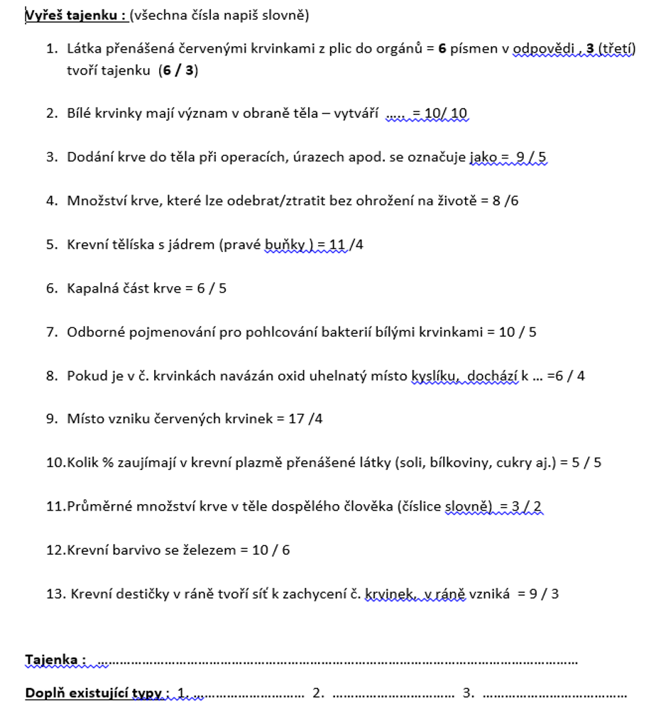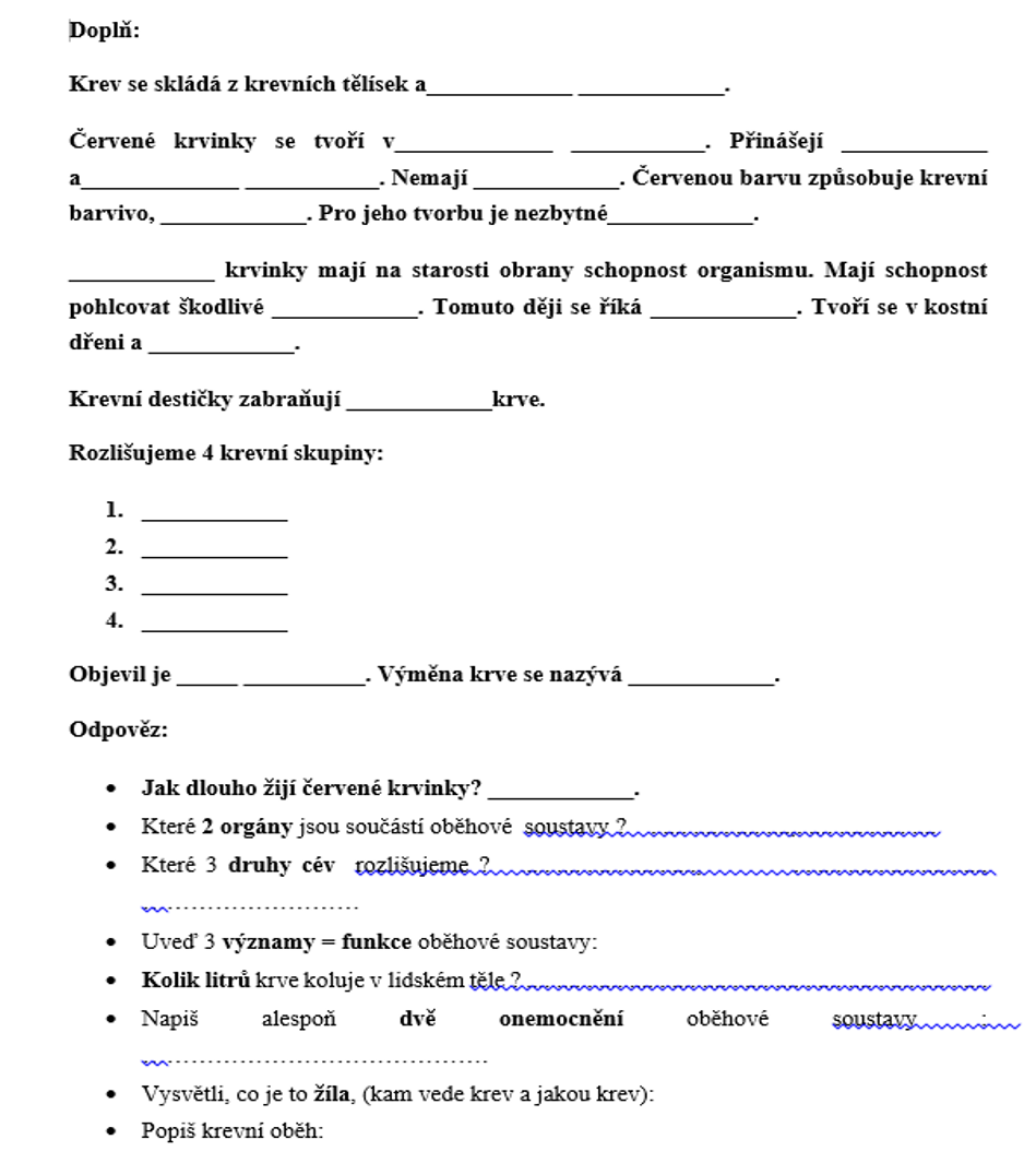 1) zapiš si do sešitu datum a téma hodiny: Oběhová soustava - krevní těkutiny