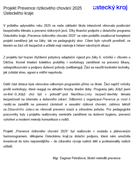 I v letošním školním roce se nám podařila získat dotace z projektu „Prevence rizikového chování v Ústeckém kraji v roce 2019".